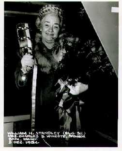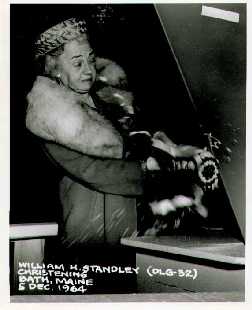 (L to R) Miss Virginia Herron, Niece of the Sponsor; RADM Edwin Herron, USN(Ret.), Brother-in-law of the Sponsor; Mrs. Edwin Herron, Sister of the Sponsor; Mr. John R. Newell, President, Bath Iron Works Corp.; Mrs. James A. Hoyt, Jr., Sister of the Sponsor; Mrs. Charles B. Wincote, Sponsor, daughter of ADM Standley, for whom ship is named;Unknown; RADM William H. Standley, Jr., USN(Ret.), Son of ADM Standley and principal speaker and brother of the Sponsor; Mrs. William H. Standley, Jr., Sister-in-law of the sponsor; Mrs. Wincote Wilson, Daughter of the Sponsor.