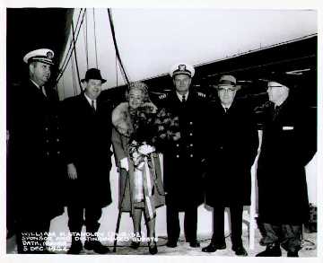 (L to R) Cdr Albert J. Otto, ChC, USN; Mr. John R. Newell, President, Bath Iron Works Corp.; Mrs. Charles B. Wincote, Sponsor; Capt Richard A. Bevernick, USN, Supervisor of Shipbuilding, Bath; RADM William H. Standley, Jr., USN(Ret.) son of ADM Standley and principal speaker; ADM Robert B. Carney, USN(Ret.), Chairman of the Board of Directors, Bath Iron Works Corp.